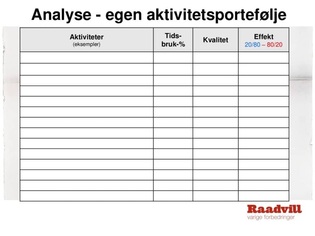 Opplevelsen av å ha for lite tid til å få løst alle arbeidsoppgavene deles av de fleste. Så er det ikke bare arbeidsoppgavene heller, men kollegaer, kunder og andre som gjør krav på tiden din. Tid er en absolutt størrelse, og det blir ikke mer av den. Å bruke storparten av tiden din på det som gir størst nytteeffekt er nøkkelen til bedre mestring og økt trivsel